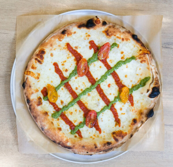 Mozzarella, Reducción de tomate 115, tomate cherry y pesto.