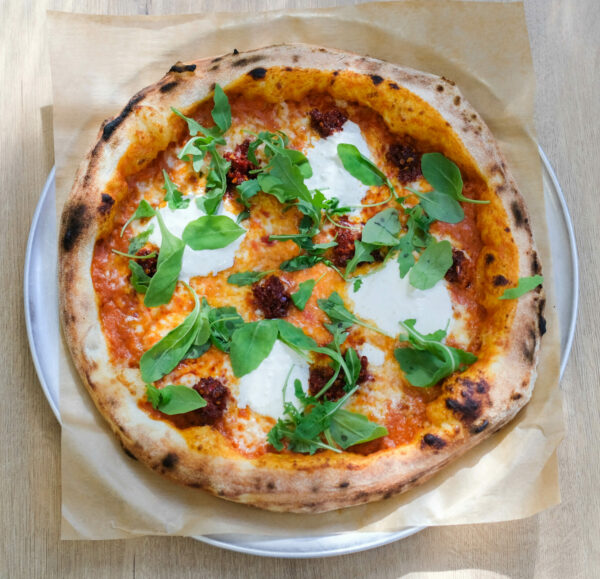 Salsa de vodka, provola ahumada, Nduja, stracciatella y rúcula.